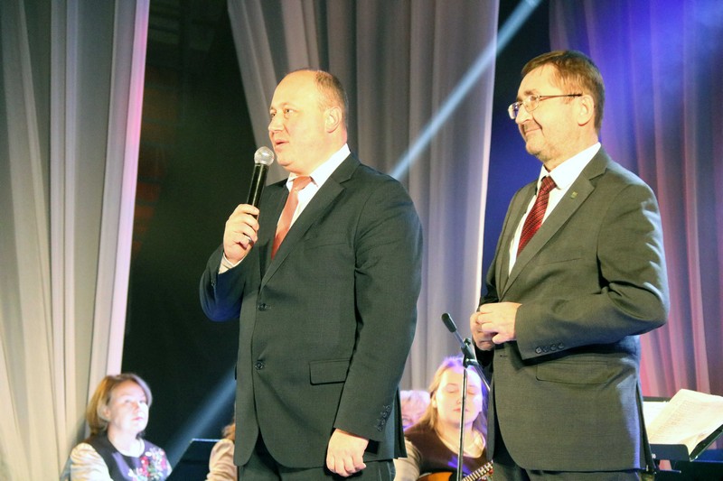 В предпраздничный день первыми на сцену поднялись глава Озерского городского округа Сергей Гергенрейдер и председатель Собрания депутатов Андрей Кузнеченков.