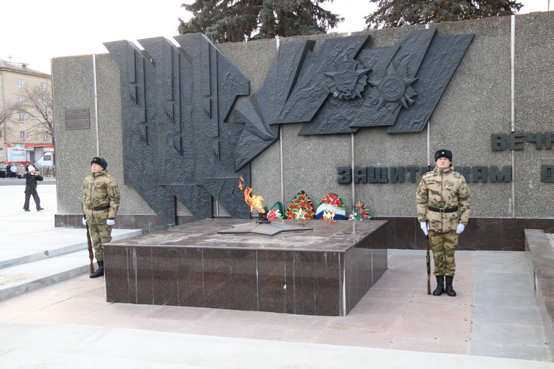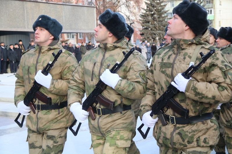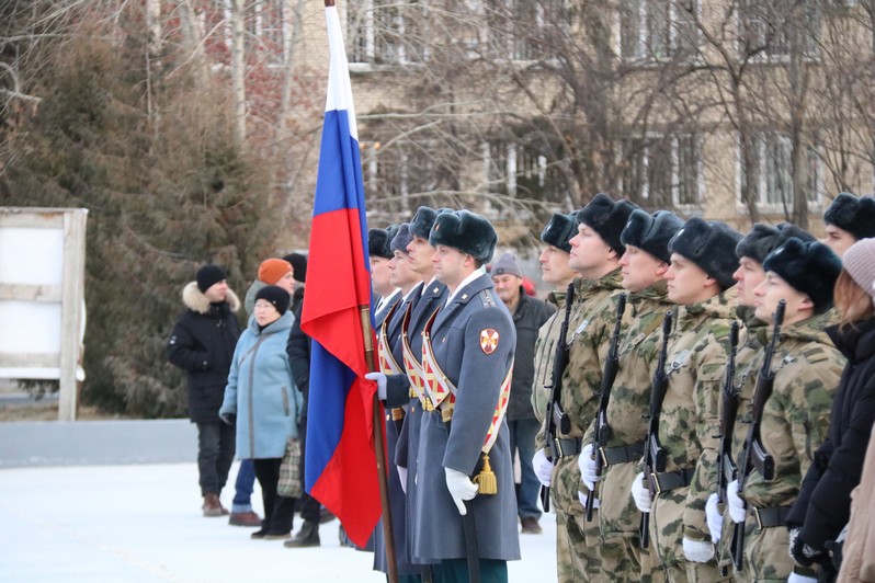 Мероприятие в честь Дня Героев Отечества началось с государственного гимна России, который прозвучал в исполнении военного оркестра Росгвардии, возле памятника был выстроен почетный караул.