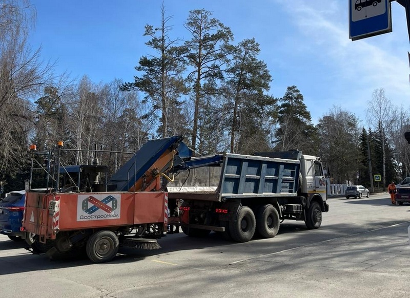Параллельно с ямочным ремонтом идёт уборка грязи и пыли, накопившихся вдоль бордюрного камня. Для этой цели подрядчиком задействован дорожный пылесос. Машина щёткой собирает остатки отсева и листвы, проводит обеспыливание дорожного полотна, вакуумным способом всё собранное транспортируется в кузов грузовика и вывозится, на газонах собранный отсев не остаётся. Дорожный пылесос захватывает по ширине площадь порядка двух метров за один проход. Там, где пылесос пройти не может, грязь собирается вручную силами дорожных рабочих и также сразу вывозится.
