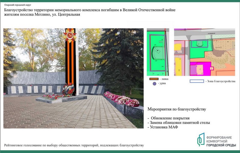 - благоустройство территории мемориального комплекса погибшим в Великой Отечественной войне жителям поселка Метлино, ул. Центральная, п. Метлино