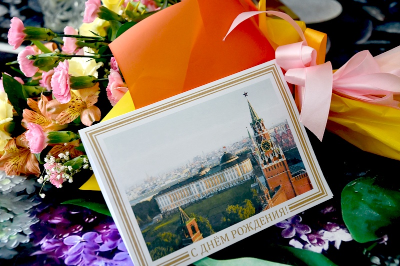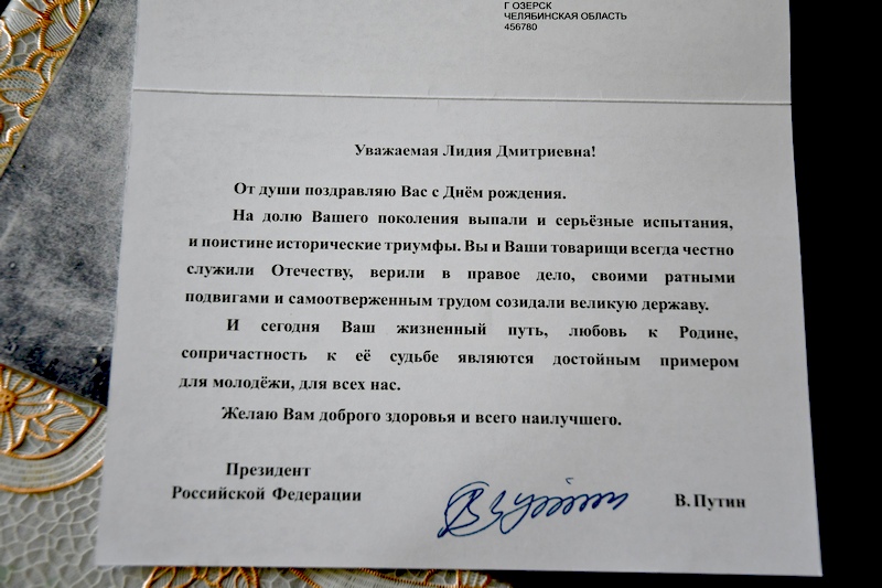 В связи с этой знаменательной датой ветерану-юбиляру была вручена поздравительная открытка за подписью Президента России Владимира Путина и большой букет цветов.