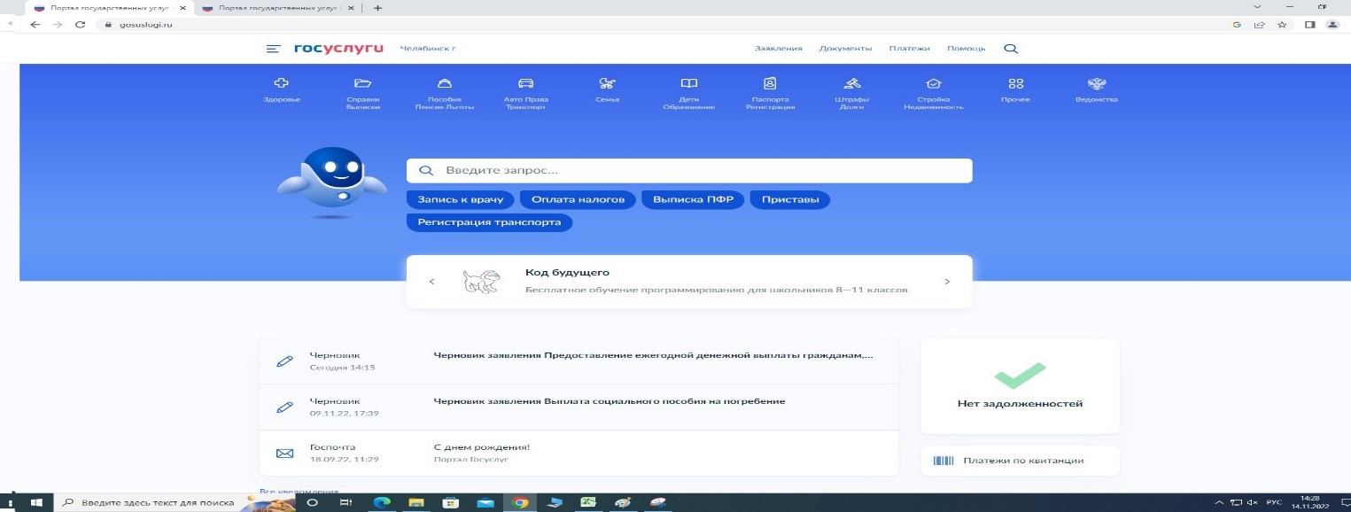 После входа на портал, необходимо нажать на поиск или надпись «Введите запрос…». Откроется окно поиска, где необходимо набрать название услуги: «Получение архивных документов».