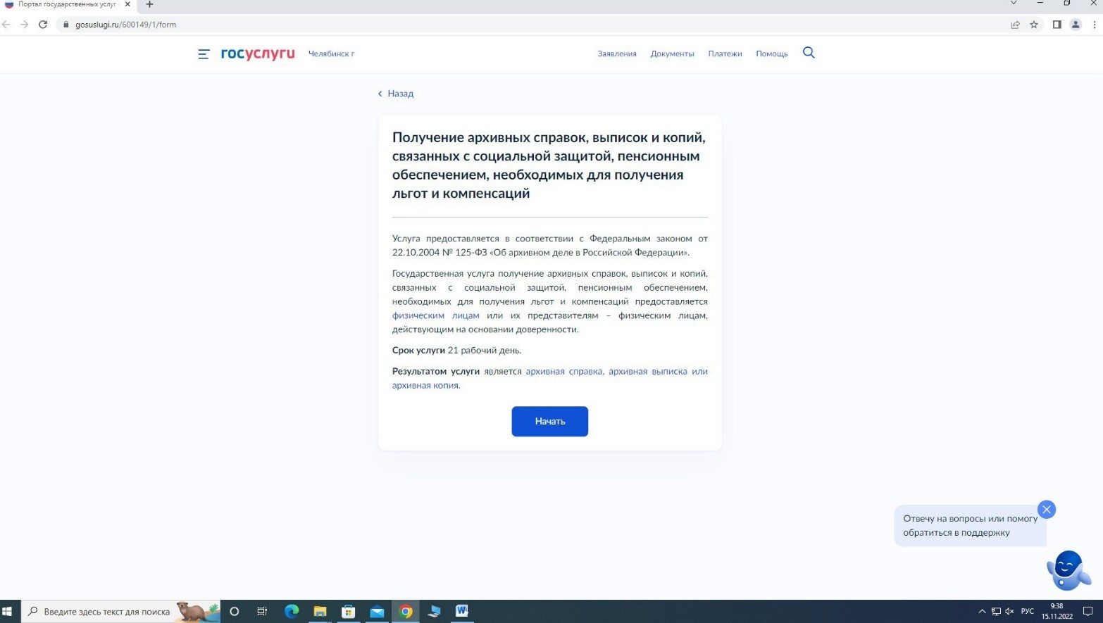 Далее высвечивается окно с основной информацией об услуге. Необходимо нажать кнопку «Начать».