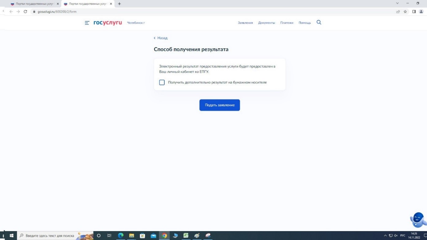 Далее нужно нажать кнопку «Подать заявление». Электронный результат предоставления услуги приходит в Ваш личный кабинет на ЕПГУ.