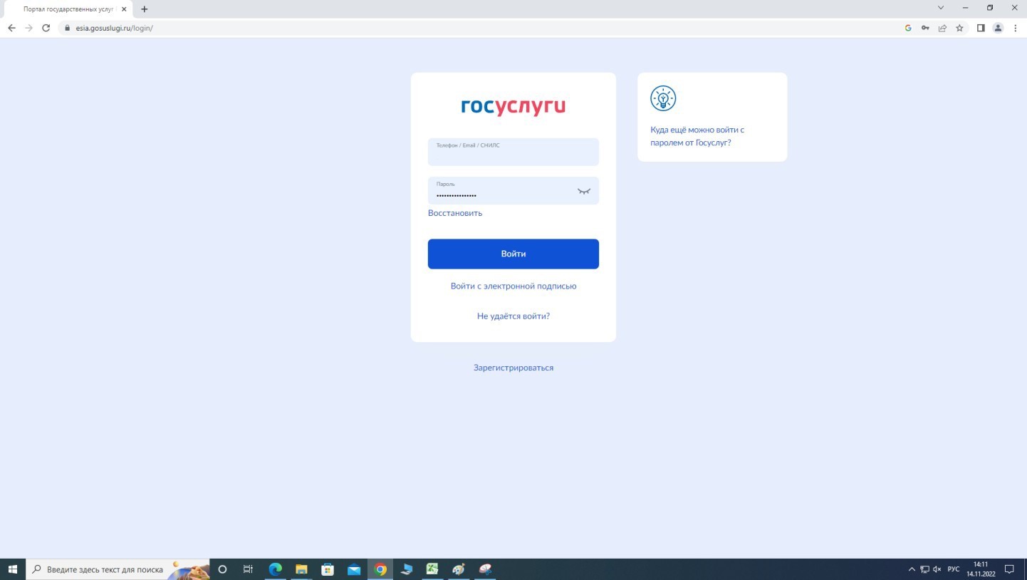 Вход на единый портал государственных услуг (https://www.gosuslugi.ru/) осуществляется посредством ввода логина, пароля от вашей учетной записи и нажатием кнопки «Войти».
