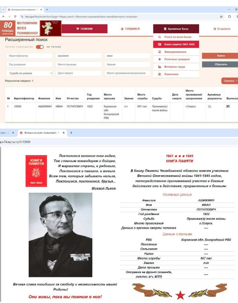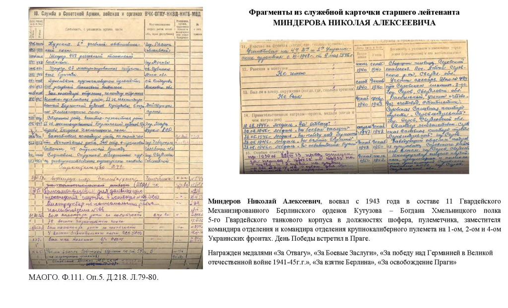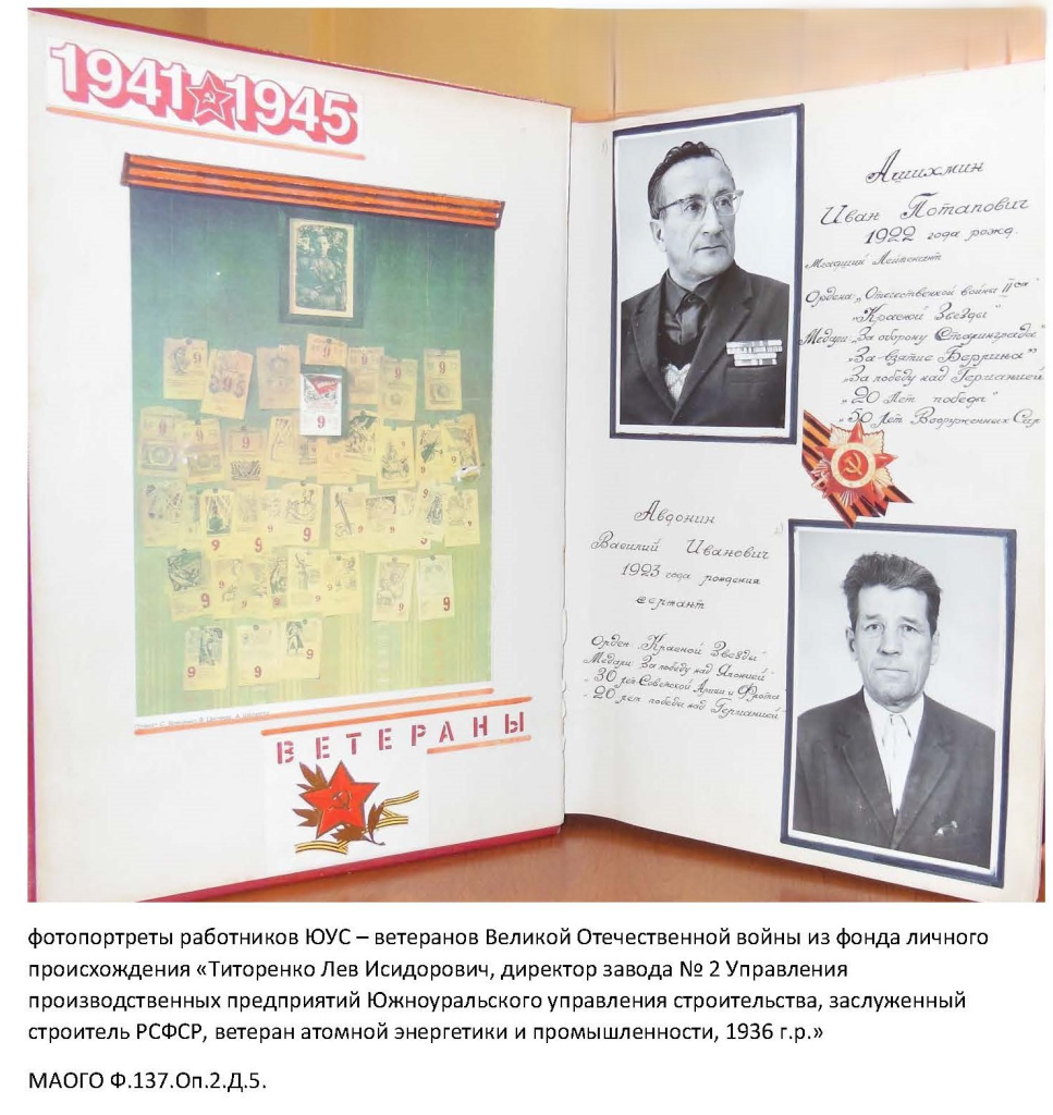 Представленная на мероприятии передвижная выставка «Живые строки войны» составлена из архивных документов фондов Южноуральского управления строительства (МАОГО. Ф.111. Оп.5. Д.218. Л.79-80) и личного происхождения заслуженного строителя РСФСР, директора завода Южноуральского управления строительства Титоренко Льва Исидоровича: фотопортреты работников ЮУС – ветеранов Великой Отечественной войны (МАОГО Ф.137.Оп2.Д.5). Этими документами озерские архивисты пополняют раздел «Книга Памяти 1941-1945» на портале «Вспомним всех поименно!» (https://hero.gov74.ru/). Выставка дополнена документами из личного семейного архива Гуриной Светланы Николаевны – журналиста и активного пользователя читального зала муниципального архива. Светлана Николаевна представила красноармейскую книжку своего отца Миндерова Николая Алексеевича, который принял военную присягу в 1943 году и был демобилизован в 1947 году. Всю военную судьбу, участие в походах, награждения и отличия можно узнать на 14 листах книжки. После войны Николай Алексеевич возглавлял партийную организацию одной из самых крупных строительных организаций региона - Южноуральского управления строительства.