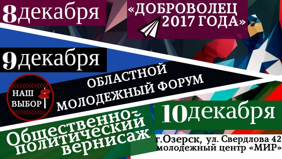 С 8 по 10 декабря в Озерске пройдёт региональный молодёжный форум «Наш Выбор» (ссылка https://vk.com/nash_vybor74 ). Мероприятие пройдет в Центре культуры и досуга молодежи "Мир".