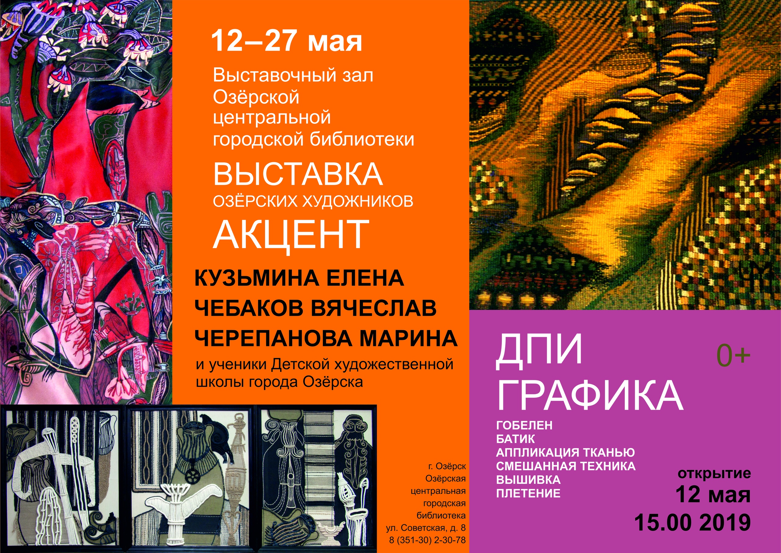 Рукотворные работы декоративно-прикладного искусства – гобелены, композиции в технике «горячий батик», аппликация тканью, вышивка и плетение соединятся с графикой, дополнив друг друга и обогатив экспозицию.
