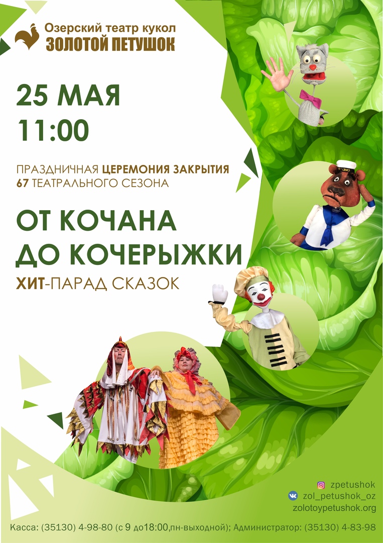 В этот знаменательный день подведем итоги программы «Путешествие в сказку» - определим самую театральную школу в Озерске. Счастливому директору школы будет вручена почетная награда – театральный Золотой петушок, созданный руками кукольных дел мастеров в цехах театра.