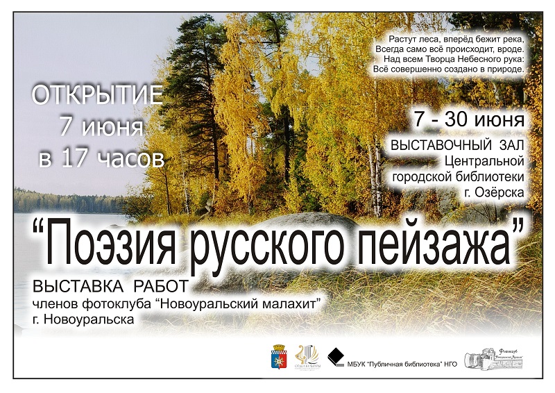7 июня в Озерск прибудет делегация из Новоуральска, чтобы открыть выставку фотографий «Поэзия русского пейзажа», на которой представлены работы фотоклуба «Новоуральский малахит». Посетители смогут не только оценить замечательные фотографии, но и лично пообщаться с авторами работ.