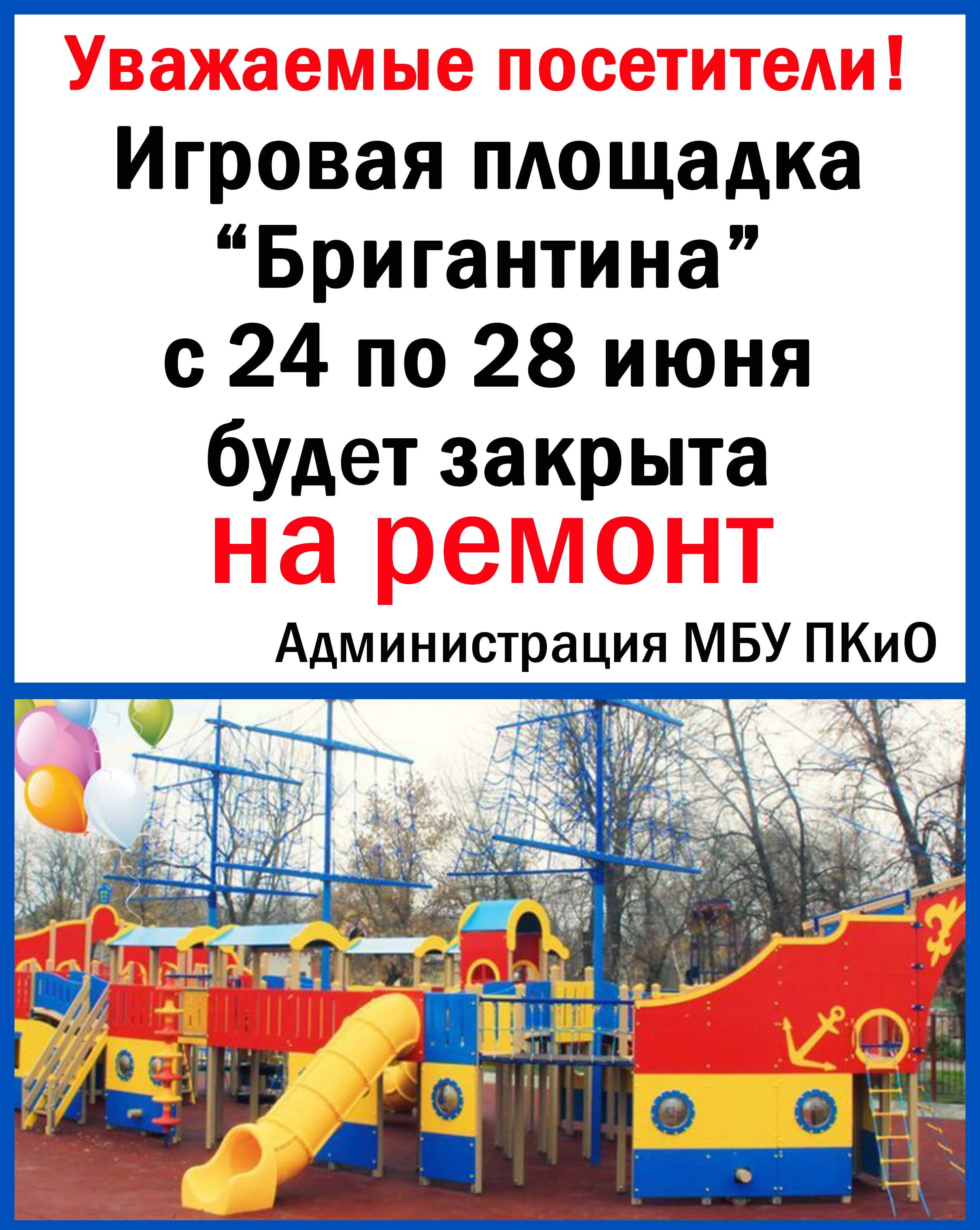 С 24 по 28 июня игровая площадка "Бригантина" будет закрыта на ремонт