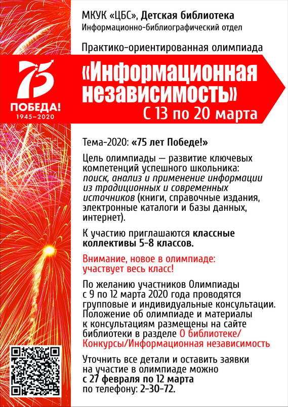 Заявки для участия в Олимпиаде принимаются с 27 февраля по 12 марта 2020 года в Информационно-библиографическом отделе по телефону: 2-30-72.