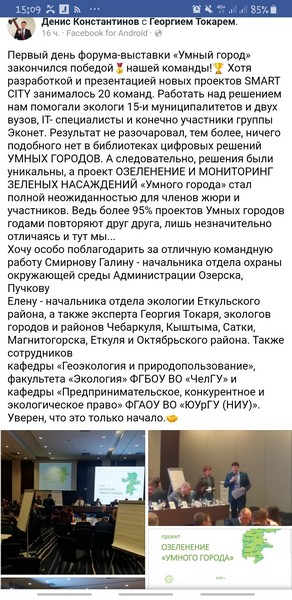 11 марта в рамках Межрегионального форума «Умный город» состоялась деловая игра в формате «Воркшоп» – «магазин рабочих решений», где участники двадцати групп решали задачи улучшения городской среды (на защиту каждого проекта было отведено до 10 минут). Участники и гости форума убедились в том, какой огромный потенциал содержится в современных цифровых решениях. Жюри во главе с заместителем главы Челябинска по экономике и инвестициям Олегом Извековым присудило победу проекту «Озеленение «Умного города», который представляли Денис Константинов – руководитель инициативной группы «Эконет» и начальник отдела окружающей среды администрации Озерского городского округа Галина Смирнова. В группу также вошли представители 15 муниципалитетов, двух университетов и IT-специалисты. Председатель жюри подчеркнул: «Все гениальное – просто!». Он отметил, что предложенный проект, включающий мониторинг зеленых насаждений, является уникальным и не похож на другие, разработанные в библиотеках цифровых решений SMART CITY. Необходимо отметить, что «Центр развития цифровых технологий», действующий в Челябинске уже проявил готовность оказать проекту-победителю поддержку в реализации.