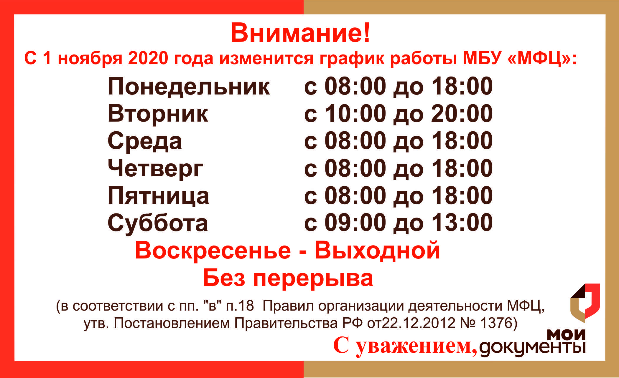 С 1 ноября изменится график работы Многофункционального центра в г.Озерске