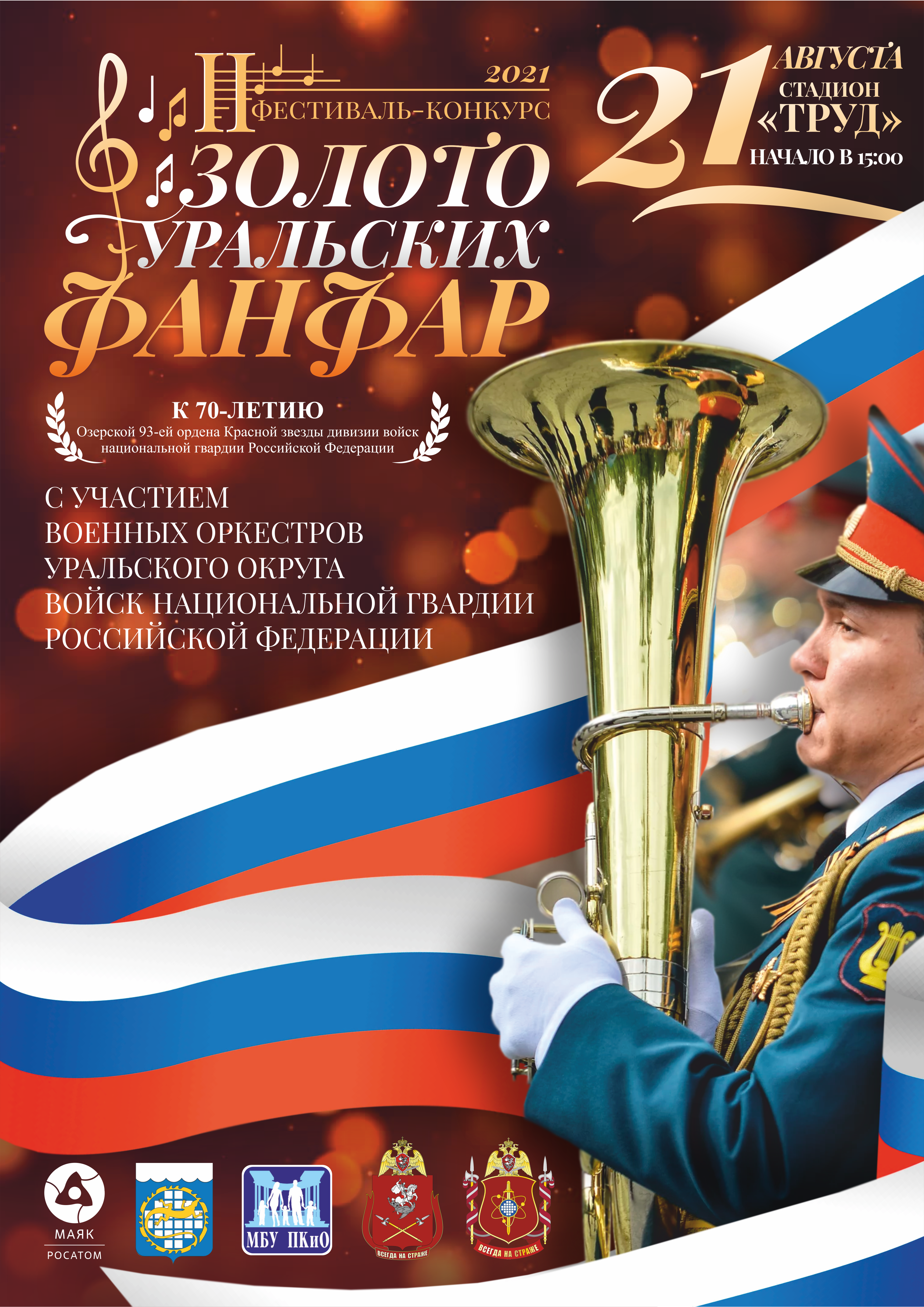 21 августа на стадионе «Труд» состоится реализация проекта Парка культуры и отдыха - победителя открытого конкурса ФГУП «ПО «Маяк» благотворительных социально-значимых проектов на территории Озерского городского округа – «II Фестиваль-конкурс военных оркестров «Золото Уральских фанфар - 2021», посвященный 70-летию 93-ей Ордена Красной звезды дивизии войск Национальной гвардии России.