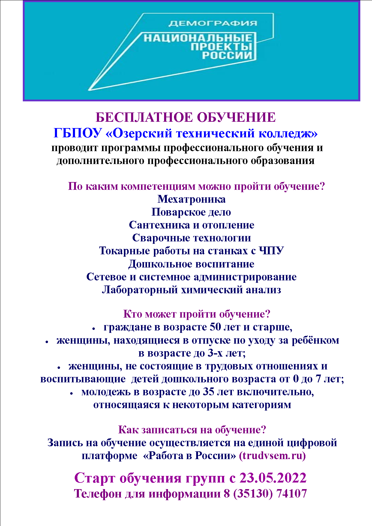 Озерский технический колледж приглашает на бесплатное обучение
