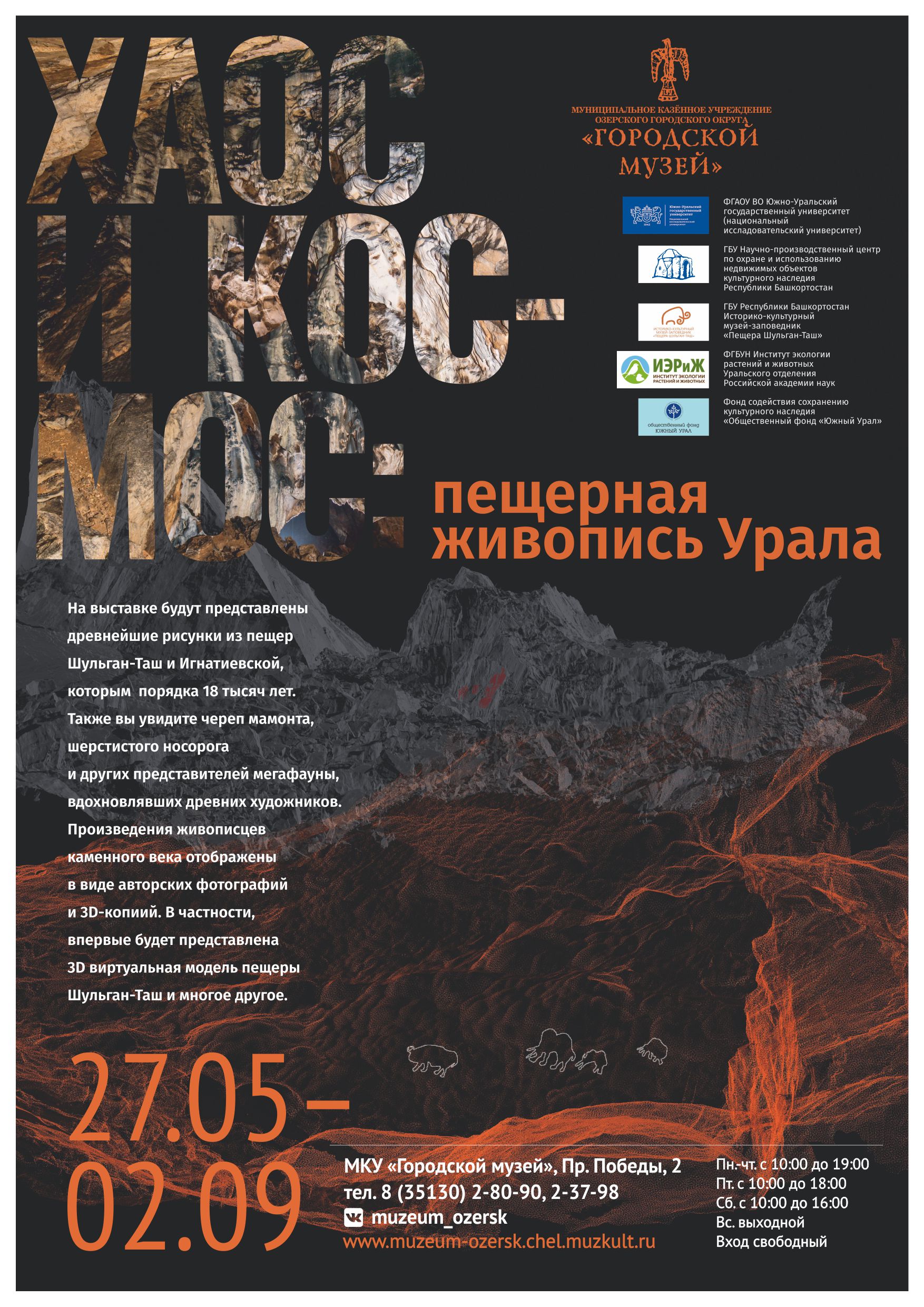 Выставка «Хаос и космос: пещерная живопись Южного Урала» любезно предоставлена «Музеем народов и технологий Урала» Южно-Уральского государственного университета. Помимо ЮУрГУ, в создании выставки приняли участие Научно-производственный центр по охране и использованию недвижимых объектов культурного наследия Республики Башкортостан, Историко-культурный музей-заповедник «Пещера Шульган-Таш», Фонд содействия сохранению культурного наследия «Общественный фонд «Южный Урал» и Озерский городской музей. Особую благодарность выражаем Васиной Юлии Валерьевне – заведующей «Музеем народов и технологий Урала» и Юрину Владимиру Ивановичу – археологу, спелеологу, исследователю пещер Южного Урала за предоставленные экспонаты для выставки!