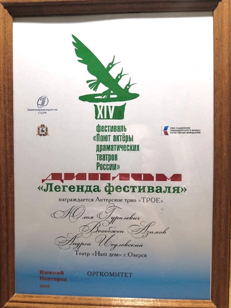 Нижний Новгород принял XIV Всероссийский фестиваль «Поют актеры драматических театров». В столицу Приволжья съехались более 100 участников из 27 городов, в том числе и из Озерска. Для участия были приглашены: з.а. РФ Вохобжон Азимов, Андрей Иодловский, Юлия Гусева, Настасья Малеева, Александра Миронова и Александра Ельцова.