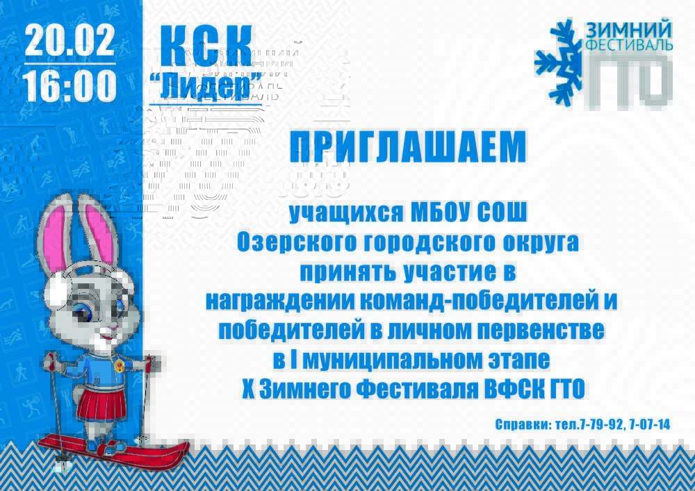 Уважаемые участники первого этапа X Зимнего Фестиваля ГТО Озерского городского округа, Центр тестирования ГТО Озерска приглашает учащихся лицеев №23 и №39, школ №24, №25, №30, №33, №34, №35, №32, №38, №41 на заключительный этап – эстафету ГТО. Мероприятие будет проводится в игровом зале КСК «Лидер». В этот же день состоится подведение итогов, чествование победителей и призеров Зимнего Фестиваля ГТО. Начало мероприятия в 16:00 часов.