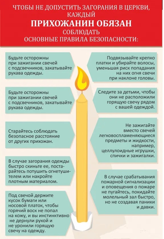 - подвязывайте крепко платки и убирайте волосы, уменьшая риск попадания их на огонь свечи при наклоне головы;