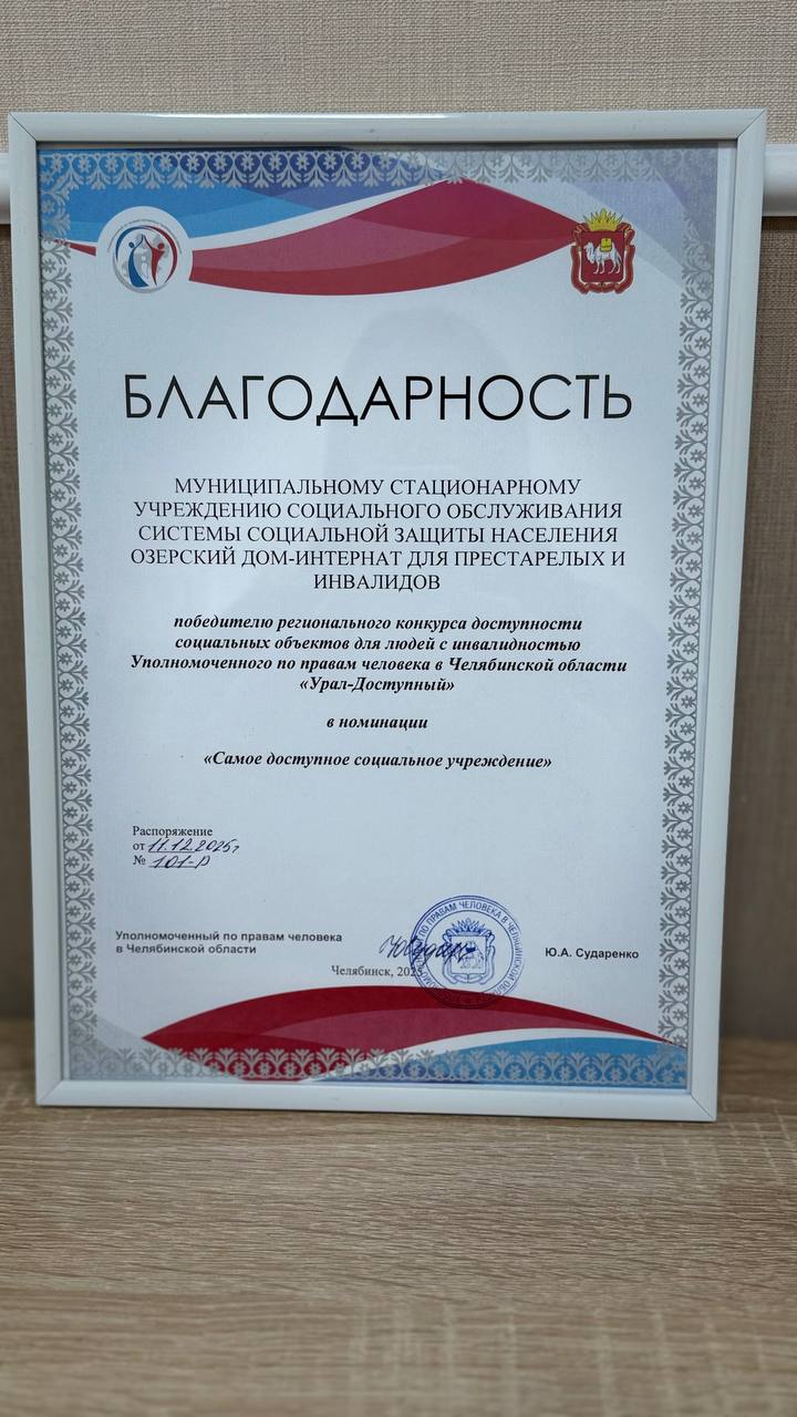 По итогам конкурса доступности социальных объектов «Урал Доступный» Уполномоченный по правам человека в Челябинской области Юлия Сударенко наградила самого достойного участника — Озёрский дом- интернат для престарелых и инвалидов.