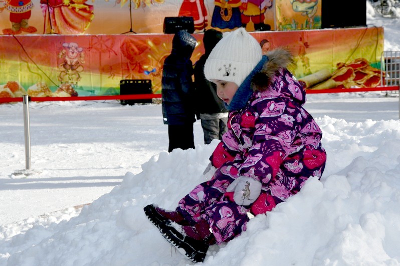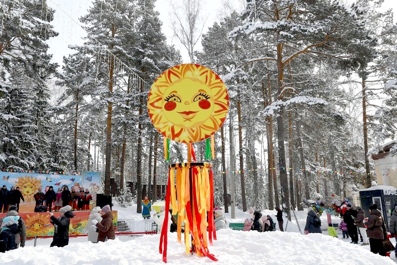 Фигура большого желтого Солнца с улыбающимися глазами и яркими лучами оказалась в центре народных гуляний - она была установлена на главной заснеженной клумбе и словно напоминала людям о том, что тепло не за горами: крепитесь, скоро лето!
